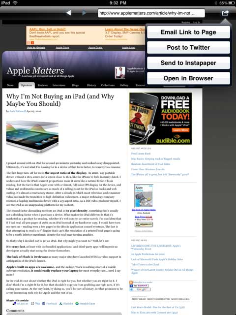 In both viewing positions (I find the vertical view the easiest and fastest way to navigate through feeds) you can star articles as favorites or for later reading. You can also email them, post a link to Twitter, open them in the Safari Browser, or send them to Instapaper—another excellent application that has been optimized for the iPad.