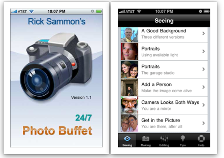 For beginning and possibly intermediate photographers, Rick Sammon’s 24/27 Photo app ($5.00) actually puts an instructional photography book on your iPhone or iPod touch. This is not a camera app, it’s a multimedia guide.